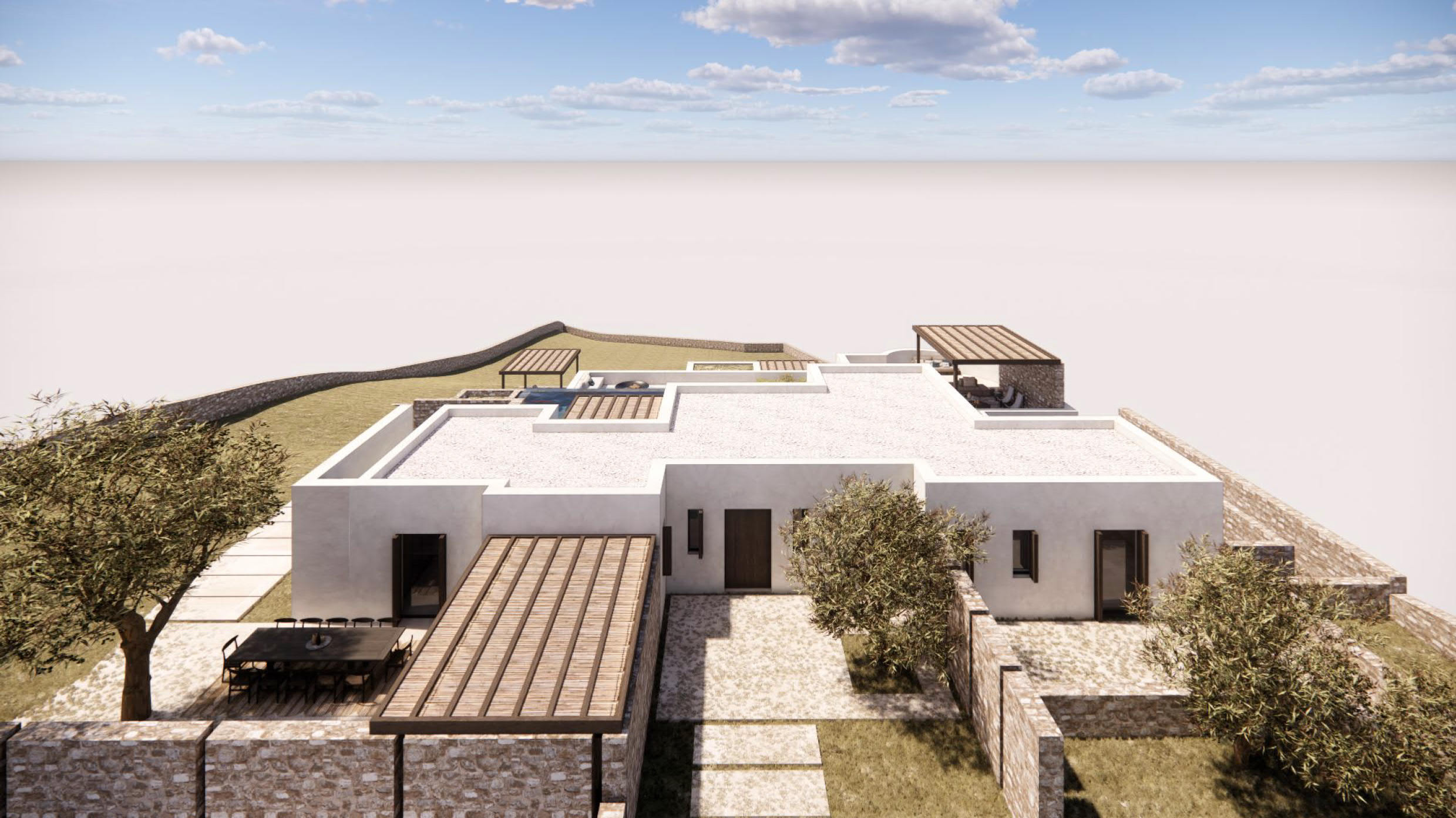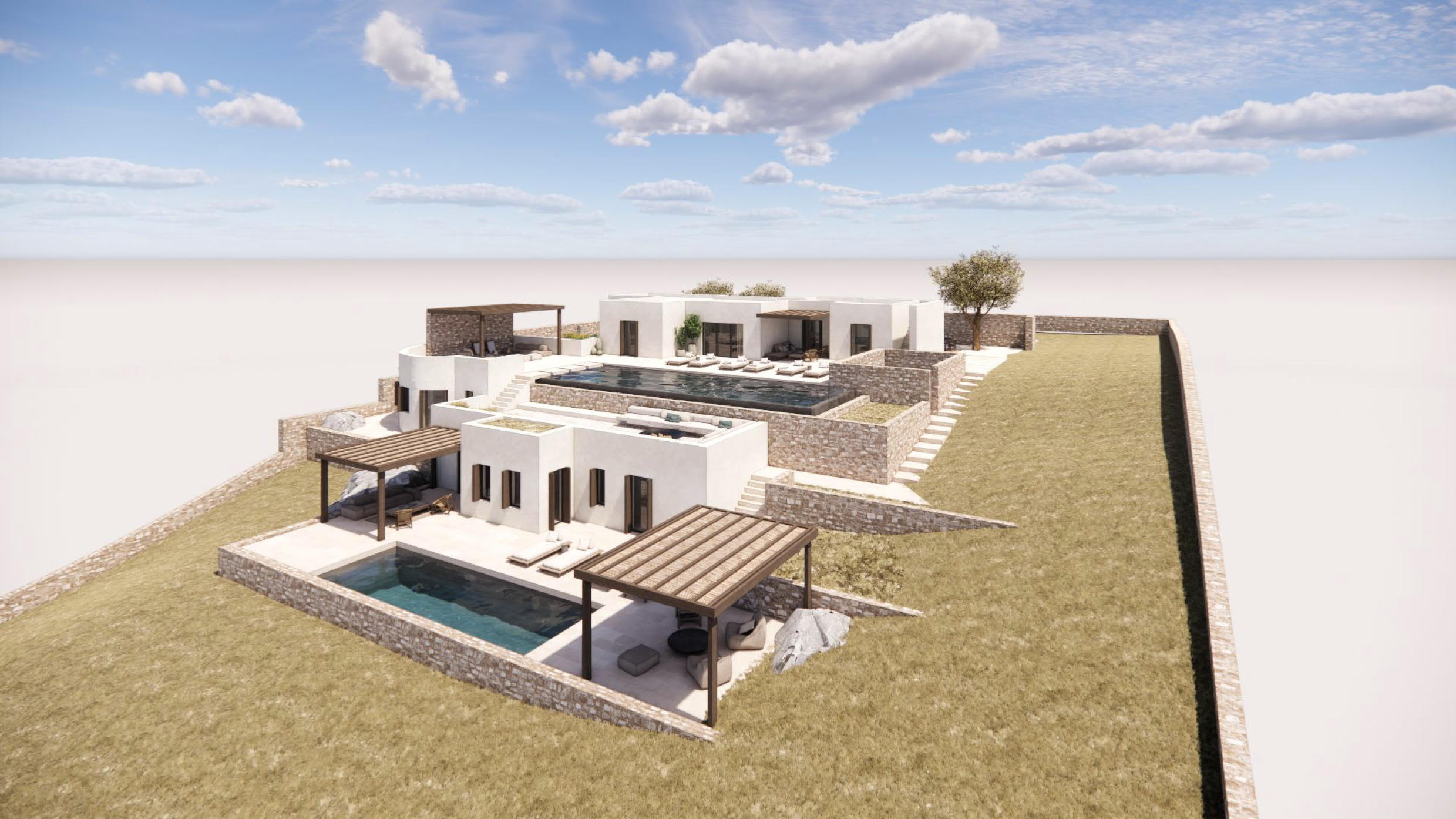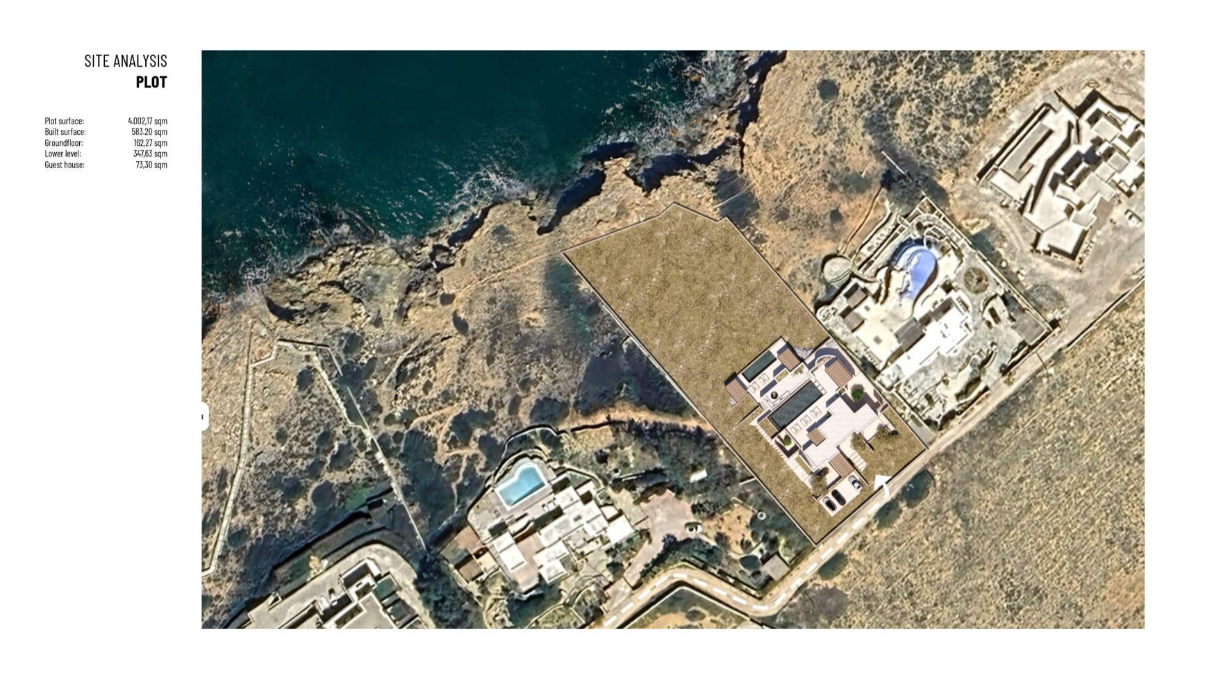 Vila u izgradnji, površine 583m², smeštena u oblasti Korakia na zapadnoj strani ostrva Paros, na placu od približno 4.002m². Idealno pozicionirana između dva glavna ulazna punkta na ostrvu. Plac se nalazi pored mora i pruža spektakularan pogled na Egejsko more ka zapadu. Teren je nagnut, sa visinskom razlikom od 16m, što omogućava izgradnju vile na više nivoa. Objekat se sastoji od prizemlja, nižeg nivoa i kuće za goste. Prizemlje površine 162m² obuhvata glavne zajedničke prostorije vile — dnevni boravak, kuhinju, trpezariju i 2 spavaće sobe sa kupatilima. Sve prostorije imaju prelep pogled na more i izlaz na spoljašnje delove vile, gde se nalazi prostor za odmor na otvorenom, roštilj i bazen (infinity pool) sa ležaljkama za sunčanje. Niži nivo ima približno 347m² i uključuje 4 spavaće sobe, glavnu spavaću sobu, dnevni boravak, teretanu sa saunom, ostave, špajz i perionicu. Kuća za goste ima površinu od 73m² i sastoji se od 3 spavaće sobe sa kupatilima, svaka sa svojim spoljnim prostorom za odmor i bazenom sa ležaljkama. Sve spavaće sobe na nižem nivou, kao i one u kući za goste, imaju poseban spoljašnji pristup. LOKACIJA I PRISTUP: Do vile se dolazi lokalnim putem sa istočne strane, a udaljena je oko 12–13 minuta vožnje od glavne luke Parikia (5,3 km) i aerodroma (7,9 km). Ostrvo Paros je lako dostupno avionom iz Međunarodnog aerodroma u Atini i drugih grčkih aerodroma poput aerodroma u Solunu. Paros je takođe povezan trajektima sa Pirejem i drugim lukama. Klasični trajekti prelaze rutu Pirej–Paros za oko 4,5 sata, dok brzi trajekti putuju oko 3 sata. Ostrvo je povezano i sa lukama Lavrio i Rafina, dok luke Naoussa i Piso Livadi povezuju Paros sa drugim Kikladskim ostrvima. Iz luke Pounta moguće je preći trajektom na obližnje ostrvo Antiparos. Paros je jedno od najlepših grčkih ostrva, poznato po beskrajnim peščanim plažama, šarmantnim tradicionalnim selima i živopisnom noćnom životu. Nalazi se u središtu Kiklada i ima oko 120 km obale. Ostrvo na jedinstven način kombinuje moderne i tradicionalne elemente, spajajući kikladski stil arhitekture, magične plaže, izvanrednu gastronomiju, poznate lokalne specijalitete i istorijske spomenike. Cena zavisi od faze izgradnje: Trenutna cena (u toku izgradnje): 2.200.000 € Cena po završetku izgradnje: 4.500.000 € Na navedenu cenu se obračunava posrednička naknada.