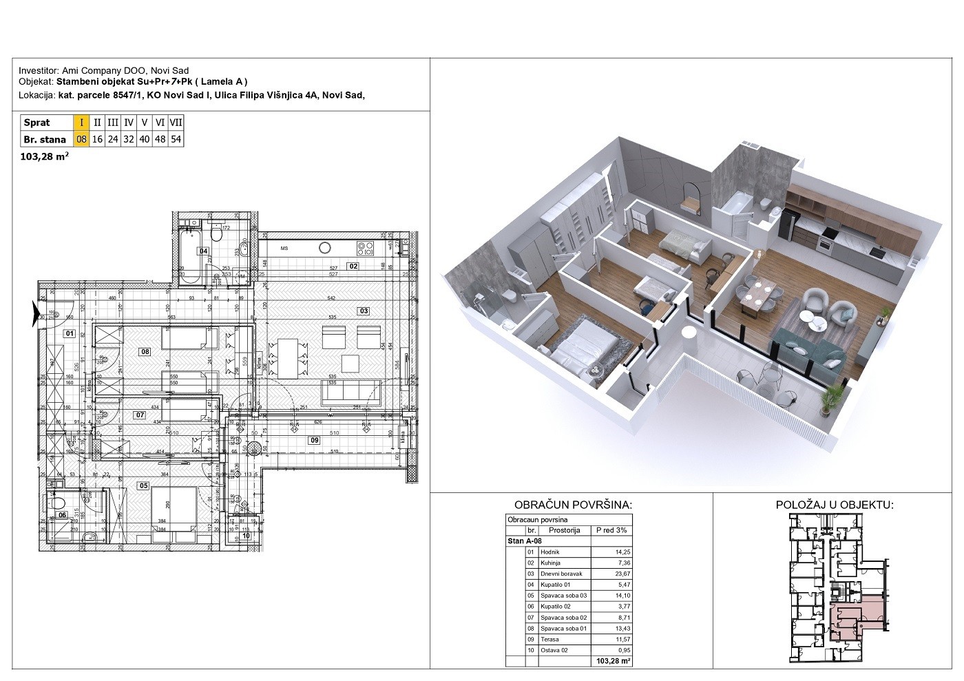 Na izuzetno atraktivnoj lokaciji, investitor Ami Invest 021 gradi visokokvalitetni stambeni objekat u blizini strogog centra grada, keja, Riblje pijace, obrazovnih i kulturnih objekata. U ponudi četvorosoban stan u izgradnji površine 103m². Stan je dvostrane orijentacije gde sve prostorije imaju izlaz - pogled na terasu. Veliki dnevni boravak koji sa kuhinjom ima oko 30m², tri spavaće sobe od kojih je jedna master sa kupatilom. Hodnik sa mogućstvom ugradnje plakara, kupatilo i ostava. Mogućnost kupovine garažnog mesta u garaži u suterenu objekta. Ami invest 021 je nova kompanija koja prati nove trendove u izgradnji objekata i koristi najsavremenije materijale, sa ciljem poboljšanja energetske efikasnosti i smanjenja troškova. Kupcima će biti omogućen uvid u kvalitet gradnje, tako što će biti upoznati sa vrstom ugradnih materijala poput keramike, parketa, unutrašnjih i ulaznih vrata, sanitarija…. Objekat će biti okružen zelenim površinama i uređenim prostorom za decu. Navedena cena je sa uključenim PDV-om bez naplate agencijske naknade od kupca. Rok izgradnje avgust 2026. godine. Više informacija na tel: 0631100099